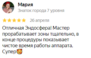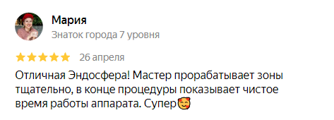установленной дистрибьютором.Если Вы видите предложение со стоимостью ниже 4500 (очень популярная цена 2500–2900), то это однозначно указывает на то, что либо процедура делается не оригинальным аппаратом «Эндосфера», либо аппаратом, который уже много лет не обслуживается у дистрибьютора (для эффективности процедуры регулярное обслуживание необходимо).